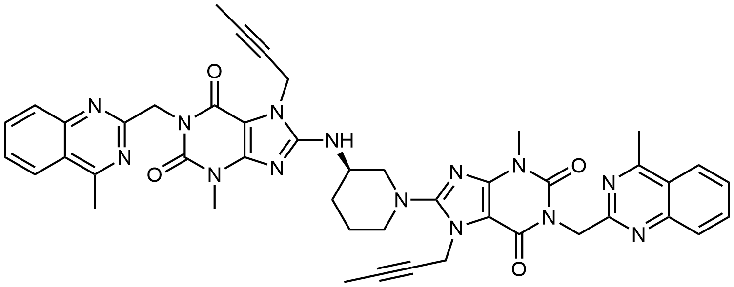 Synonyms: (R)-7-(but-2-yn-1-yl)-8-(3-((7-(but-2-yn-1-yl)-3-methyl-1-((4-methylquinazolin-2-yl)methyl)-2,6-dioxo-2,3,6,7-tetrahydro-1H-purin-8-yl)amino)piperidin-1-yl)-3-methyl-1-((4-methylquinazolin-2-yl)methyl)-1H-purine-2,6(3H,7H)-dione