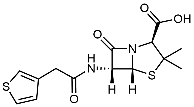 Synonyms: (4S)-2-((2-carboxy-2-(thiophen-3-yl)acetamido)methyl)-5,5-dimethylthiazolidine-4-carboxylic acid