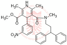 Synonyms: methyl 5-((3,3-diphenylpropyl)(methyl)carbamoyl)-2,6-dimethyl-4-(3-nitrophenyl)-1,4-dihydropyridine-3-carboxylate
