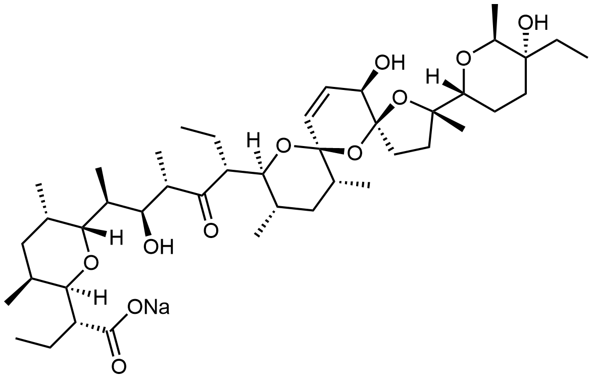 Synonyms: sodium (R)-2-((2R,3S,5S,6R)-6-((2S,3S,4S,6R)-6-((2S,5S,7R,9S,10S,12R,15R)-2-((2R,5R,6S)-5-ethyl-5-hydroxy-6-methyltetrahydro-2H-pyran-2-yl)-15-hydroxy-2,10,12-trimethyl-1,6,8-trioxadispiro[4.1.57.35]pentadec-13-en-9-yl)-3-hydroxy-4-methyl-5-oxooctan-2-yl)-3,5-dimethyltetrahydro-2H-pyran-2-yl)butanoate