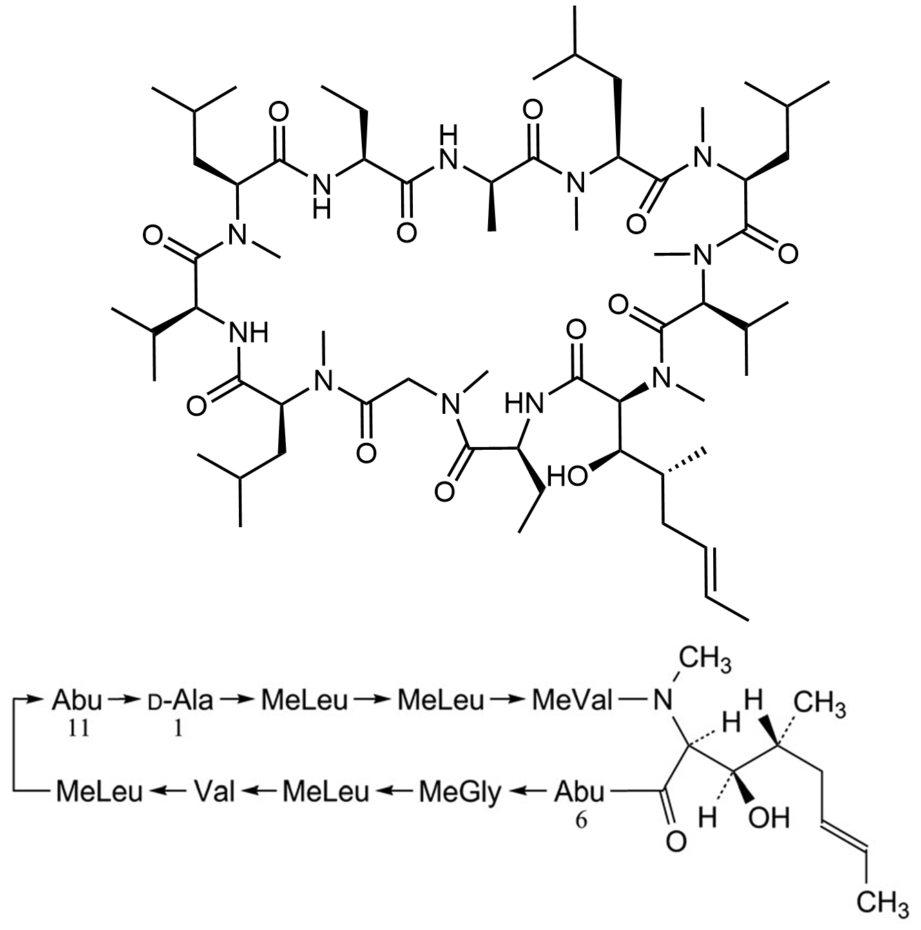 Synonyms: (3S,6S,9S,12R,15S,18S,21S,24S,30S,33S)-15,30-diethyl-33-((1R,2R,E)-1-hydroxy-2-methylhex-4-en-1-yl)-6,9,18,24-tetraisobutyl-3,21-diisopropyl-1,4,7,10,12,19,25,28-octamethyl-1,4,7,10,13,16,19,22,25,28,31-undecaazacyclotritriacontan-2,5,8,11,14,17,20,23,26,29,32-undecaone
