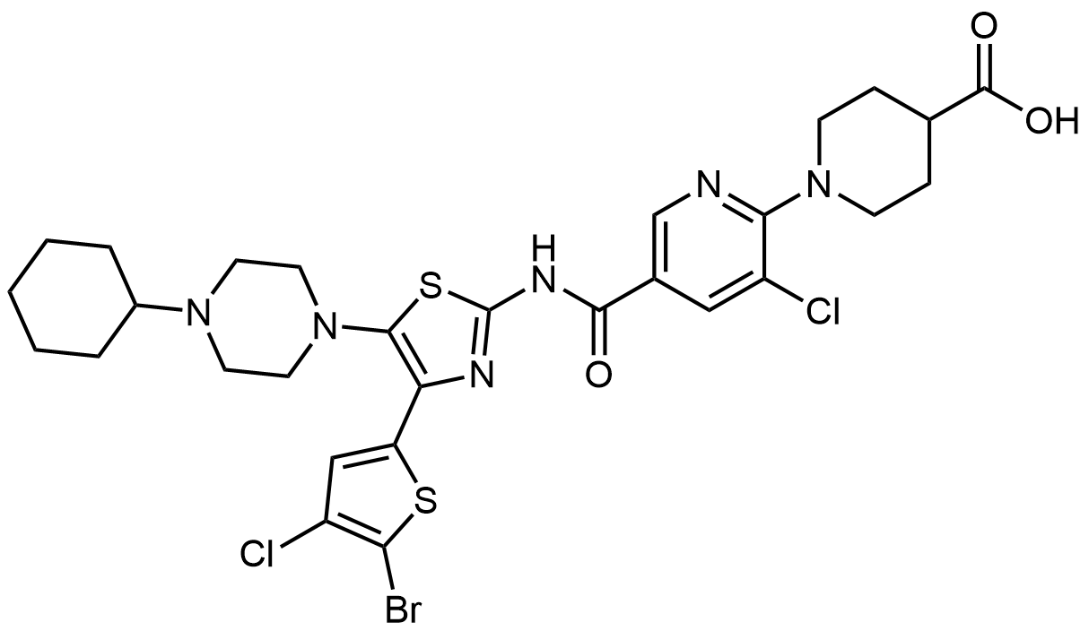 Synonyms: 1-(5-((4-(5-bromo-4-chlorothiophen-2-yl)-5-(4-cyclohexylpiperazin-1-yl)thiazol-2-yl)carbamoyl)-3-chloropyridin-2-yl)piperidine-4-carboxylic acid
