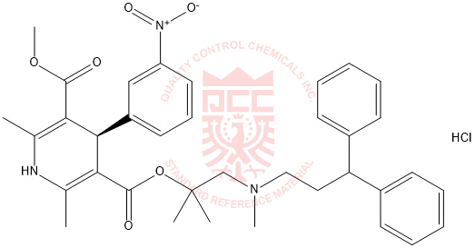 Synonyms: (R)-3-(1-((3,3-diphenylpropyl)(methyl)amino)-2-methylpropan-2-yl) 5-methyl 2,6-dimethyl-4-(3-nitrophenyl)-1,4-dihydropyridine-3,5-dicarboxylate hydrochloride