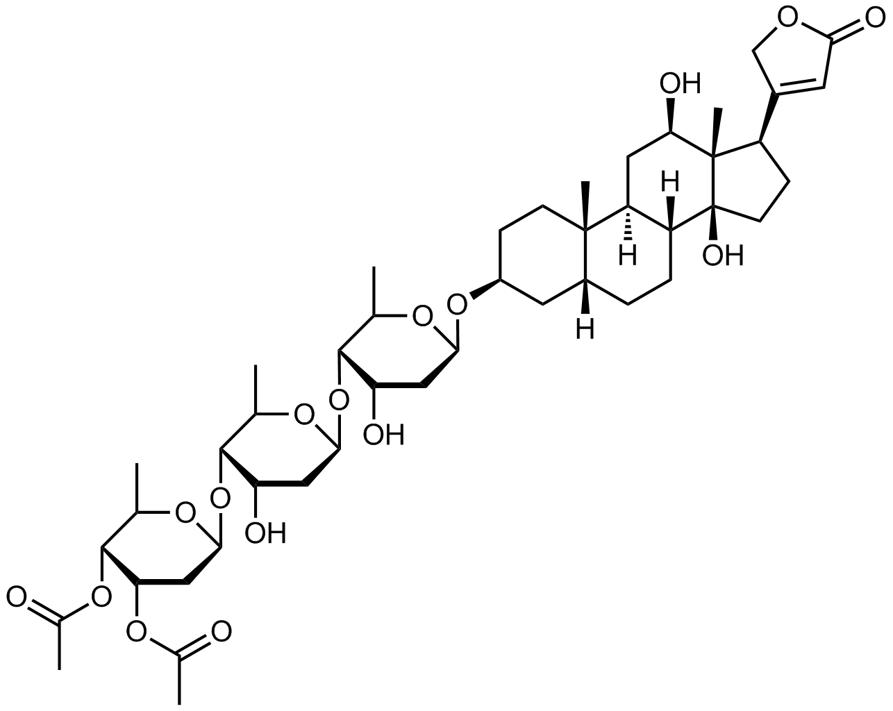 Synonyms: (2R,3R,4S,6S)-6-(((2R,3S,4S,6S)-6-(((2R,3S,4S,6R)-6-(((3S,5R,8R,9S,10S,12R,13S,14S,17R)-12,14-dihydroxy-10,13-dimethyl-17-(5-oxo-2,5-dihydrofuran-3-yl)hexadecahydro-1H-cyclopenta[a]phenanthren-3-yl)oxy)-4-hydroxy-2-methyltetrahydro-2H-pyran-3-yl)oxy)-4-hydroxy-2-methyltetrahydro-2H-pyran-3-yl)oxy)-2-methyltetrahydro-2H-pyran-3,4-diyl diacetate