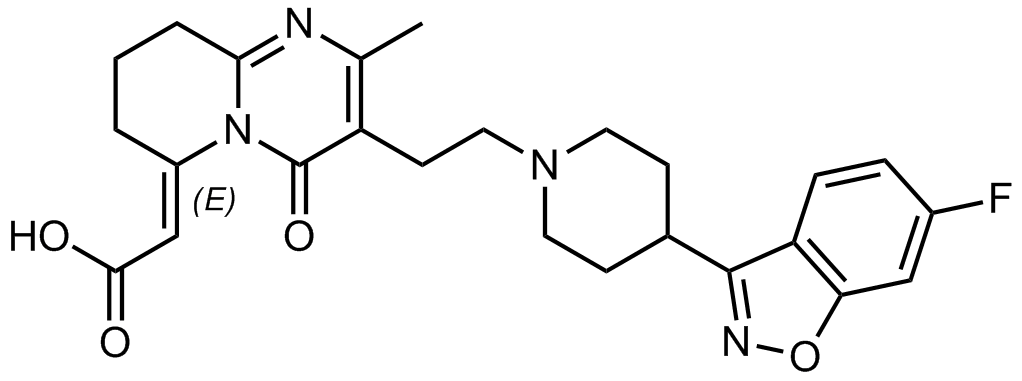 Synonyms: (E)-2-(3-(2-(4-(6-fluorobenzo[d]isoxazol-3-yl)piperidin-1-yl)ethyl)-2-methyl-4-oxo-8,9-dihydro-4H-pyrido[1,2-a]pyrimidin-6(7H)-ylidene)acetic acid