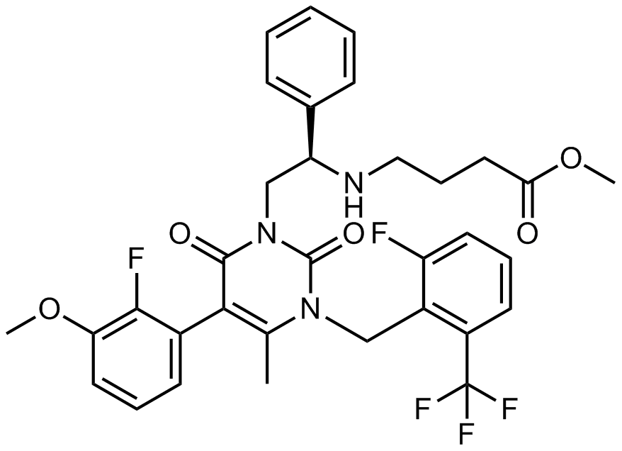 Synonyms: (R)-methyl 4-((2-(5-(2-fluoro-3-methoxyphenyl)-3-(2-fluoro-6-(trifluoromethyl)benzyl)-4-methyl-2,6-dioxo-2,3-dihydropyrimidin-1(6H)-yl)-1-phenylethyl)amino)butanoate