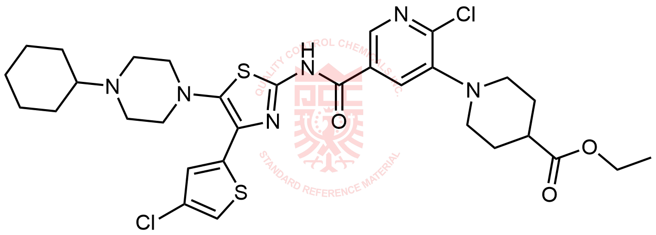 Synonyms: ethyl 1-(2-chloro-5-((4-(4-chlorothiophen-2-yl)-5-(4-cyclohexylpiperazin-1-yl)thiazol-2-yl)carbamoyl)pyridin-3-yl)piperidine-4-carboxylate