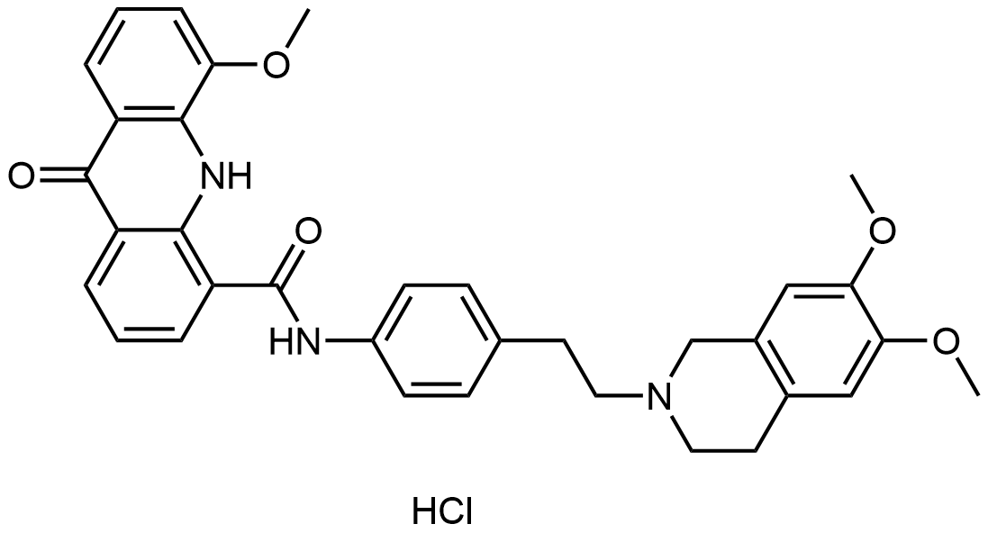 Synonyms: N-(4-(2-(6,7-dimethoxy-3,4-dihydroisoquinolin-2(1H)-yl)ethyl)phenyl)-5-methoxy-9-oxo-9,10-dihydroacridine-4-carboxamide hydrochloride