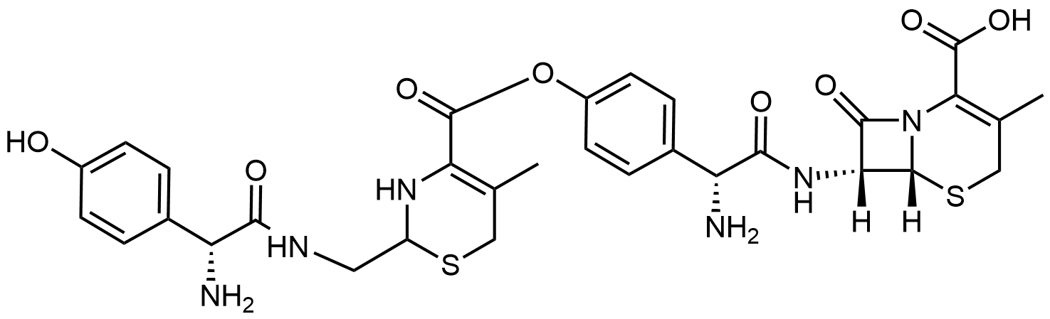 Synonyms: (6R,7R)-7-((2R)-2-amino-2-(4-((2-(((R)-2-amino-2-(4-hydroxyphenyl)acetamido)methyl)-5-methyl-3,6-dihydro-2H-1,3-thiazine-4-carbonyl)oxy)phenyl)acetamido)-3-methyl-8-oxo-5-thia-1-azabicyclo[4.2.0]oct-2-ene-2-carboxylic acid