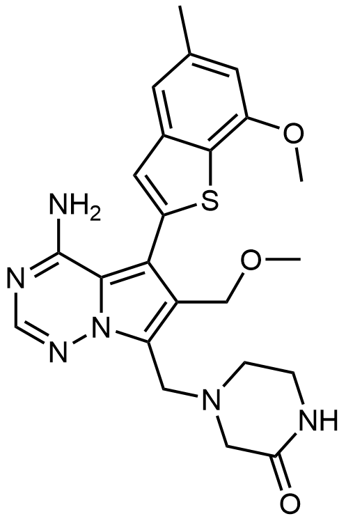 Synonyms: 4-((4-amino-5-(7-methoxy-5-methylbenzo[b]thiophen-2-yl)-6-(methoxymethyl)pyrrolo[2,1-f][1,2,4]triazin-7-yl)methyl)piperazin-2-one
