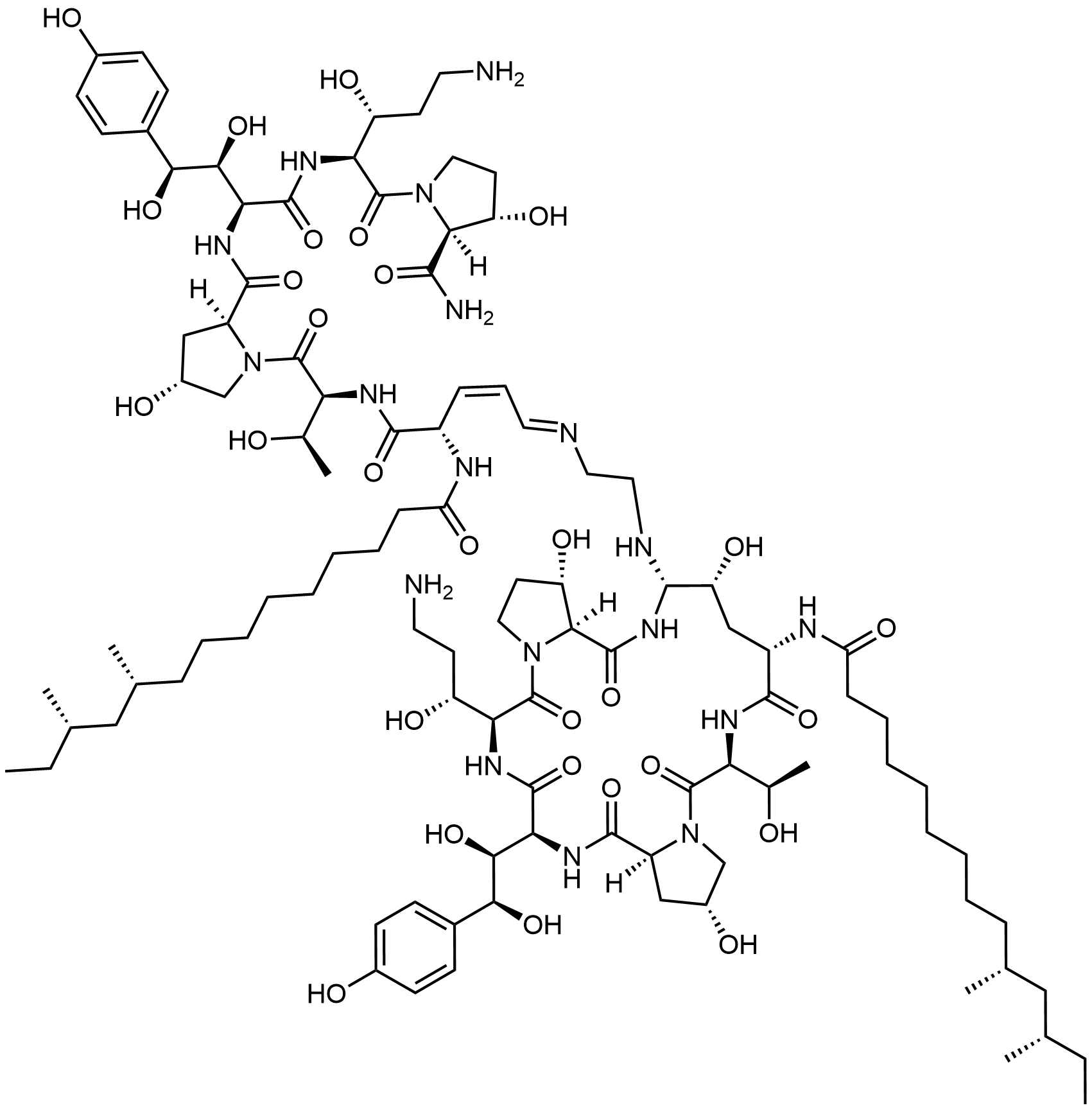 Synonyms: (2S,4R)-N-((2S,3S,4S)-1-(((2S,3R)-5-amino-1-((2S,3S)-2-carbamoyl-3-hydroxypyrrolidin-1-yl)-3-hydroxy-1-oxopentan-2-yl)amino)-3,4-dihydroxy-4-(4-hydroxyphenyl)-1-oxobutan-2-yl)-1-(((S,3Z,5E)-5-((2-(((2R,6S,9S,11R,12S,14aS,15S,20S,23S,25aS)-20-((R)-3-amino-1-hydroxypropyl)-23-((1S,2S)-1,2-dihydroxy-2-(4-hydroxyphenyl)ethyl)-9-((10R,12S)-10,12-dimethyltetradecanamido)-2,11,15-trihydroxy-6-((R)-1-hydroxyethyl)-5,8,14,19,22,25-hexaoxotetracosahydro-1H-dipyrrolo[2,1-c:2',1'-l][1,4,7,10,13,16]hexaazacyclohenicosin-12-yl)amino)ethyl)imino)-2-((10R,12S)-10,12-dimethyltetradecanamido)pent-3-enoyl)-L-threonyl)-4-hydroxypyrrolidine-2-carboxamide