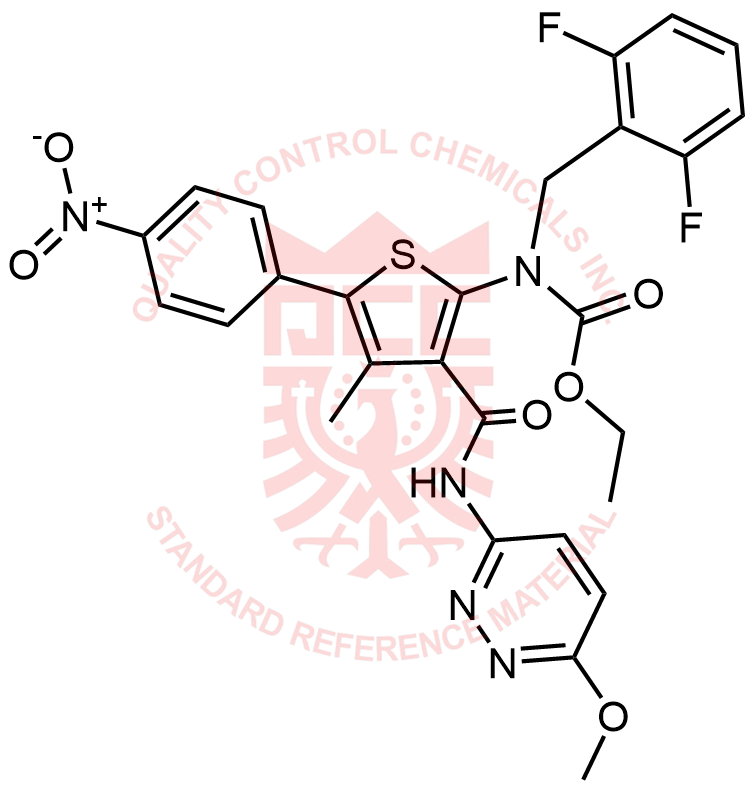Synonyms: ethyl (2,6-difluorobenzyl)(3-((6-methoxypyridazin-3-yl)carbamoyl)-4-methyl-5-(4-nitrophenyl)thiophen-2-yl)carbamate