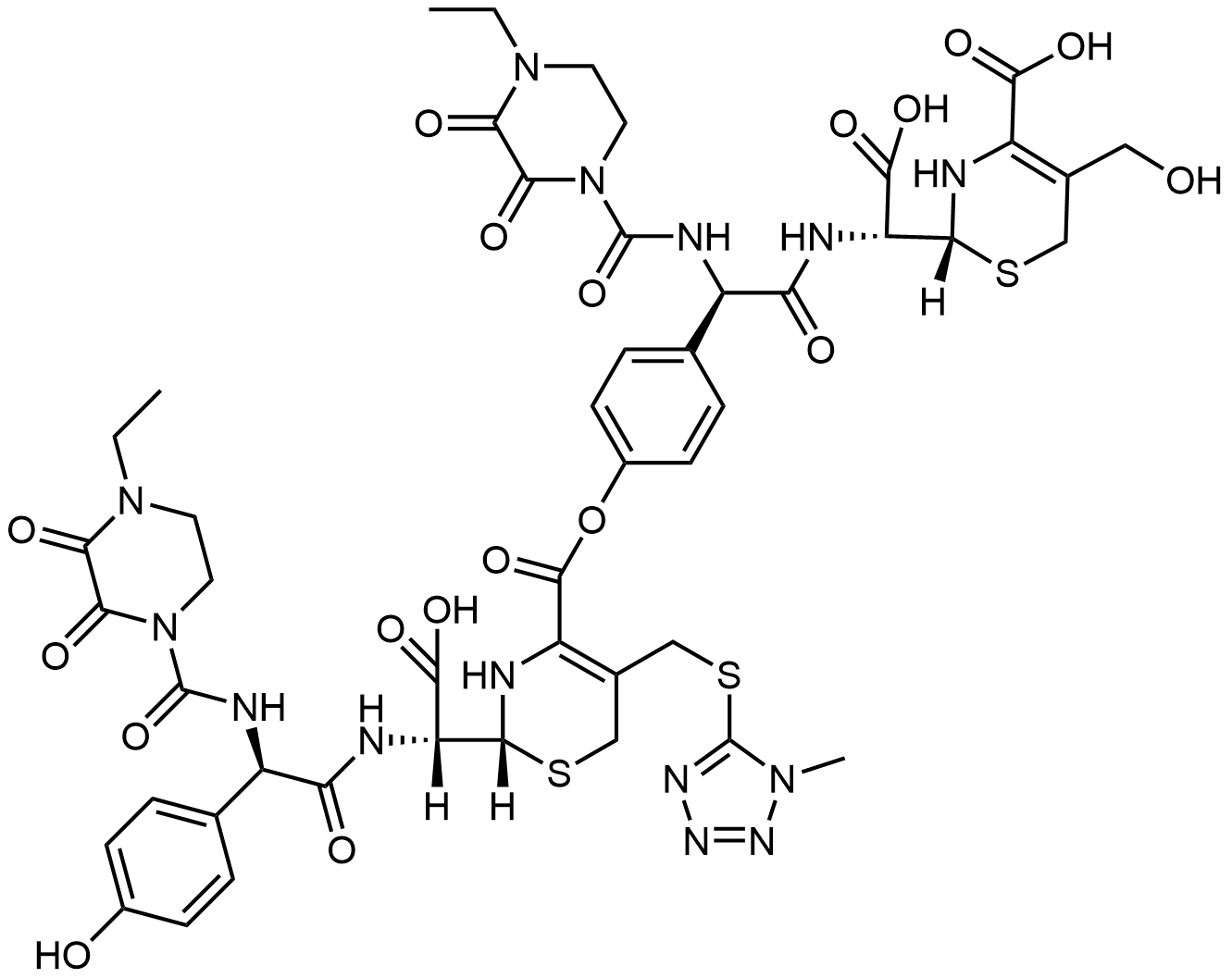 Synonyms: (R)-2-((R)-carboxy((R)-2-(4-(((R)-2-((R)-carboxy((R)-2-(4-ethyl-2,3-dioxopiperazine-1-carboxamido)-2-(4-hydroxyphenyl)acetamido)methyl)-5-(((1-methyl-1H-tetrazol-5-yl)thio)methyl)-3,6-dihydro-2H-1,3-thiazine-4-carbonyl)oxy)phenyl)-2-(4-ethyl-2,3-dioxopiperazine-1-carboxamido)acetamido)methyl)-5-(hydroxymethyl)-3,6-dihydro-2H-1,3-thiazine-4-carboxylic acid