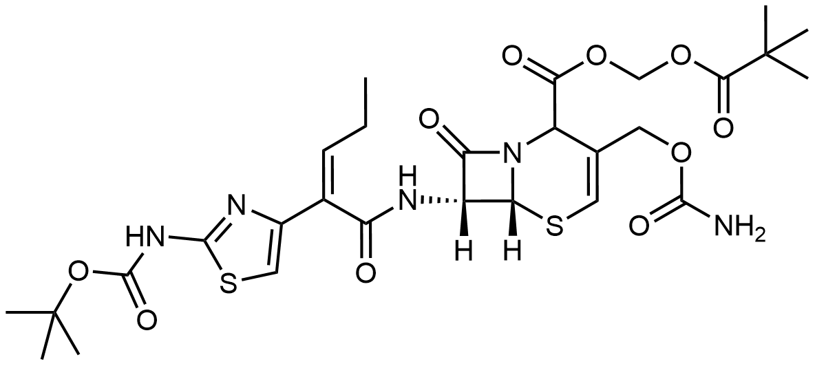 Synonyms: (pivaloyloxy)methyl (6R,7R)-7-((Z)-2-(2-((tert-butoxycarbonyl)amino)thiazol-4-yl)pent-2-enamido)-3-((carbamoyloxy)methyl)-8-oxo-5-thia-1-azabicyclo[4.2.0]oct-3-ene-2-carboxylate