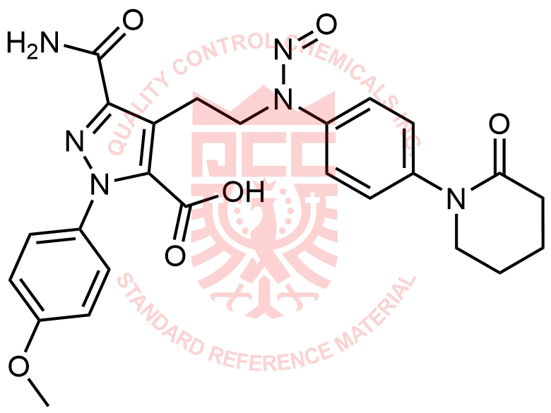 Synonyms: 3-carbamoyl-1-(4-methoxyphenyl)-4-(2-(nitroso(4-(2-oxopiperidin-1-yl)phenyl)amino)ethyl)-1H-pyrazole-5-carboxylic acid
