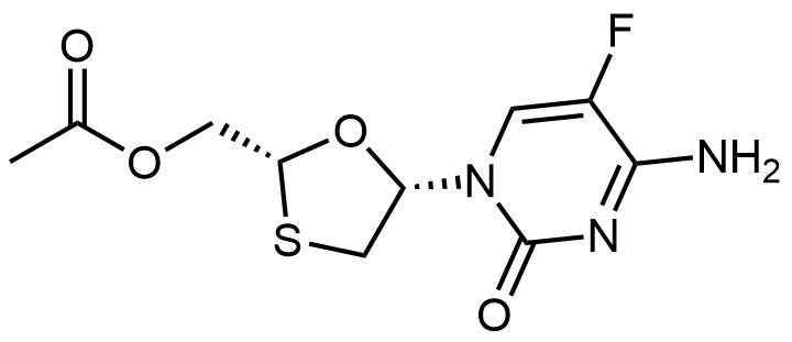 Synonyms: ((2R,5S)-5-(4-amino-5-fluoro-2-oxopyrimidin-1(2H)-yl)-1,3-oxathiolan-2-yl)methyl acetate