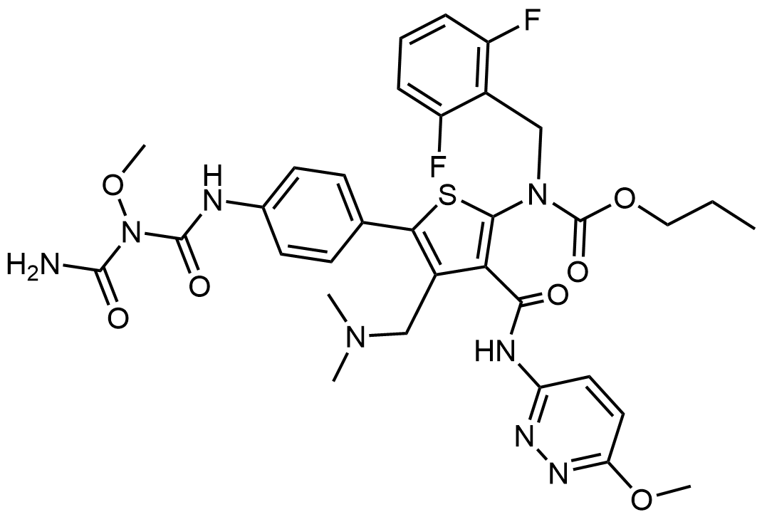 Synonyms: propyl (5-(4-(3-carbamoyl-3-methoxyureido)phenyl)-4-((dimethylamino)methyl)-3-((6-methoxypyridazin-3-yl)carbamoyl)thiophen-2-yl)(2,6-difluorobenzyl)carbamate