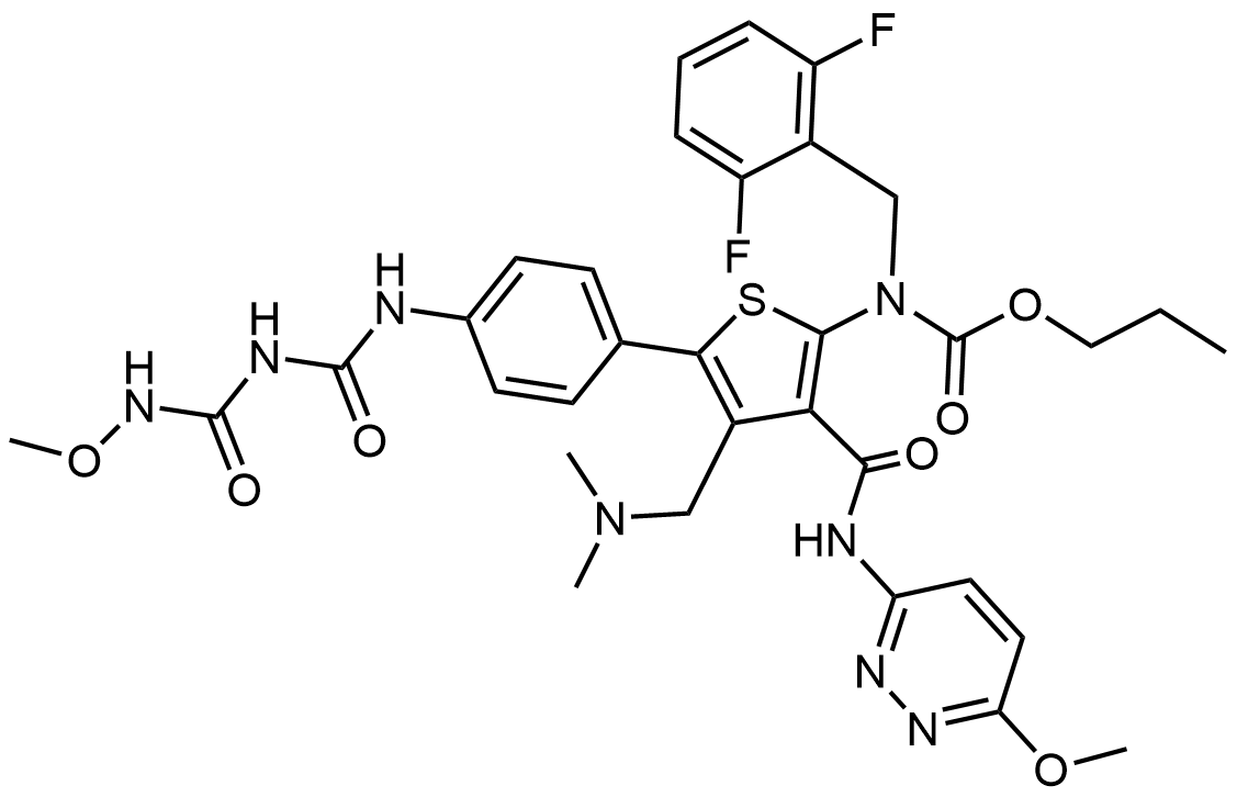 Synonyms: propyl (2,6-difluorobenzyl)(4-((dimethylamino)methyl)-5-(4-(3-(methoxycarbamoyl)ureido)phenyl)-3-((6-methoxypyridazin-3-yl)carbamoyl)thiophen-2-yl)carbamate