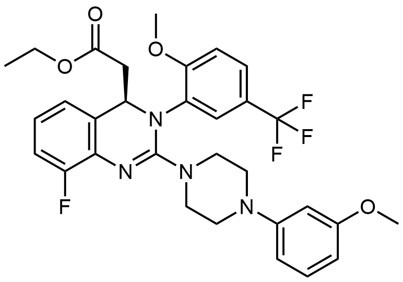 Synonyms: ethyl (R)-2-(8-fluoro-3-(2-methoxy-5-(trifluoromethyl)phenyl)-2-(4-(3-methoxyphenyl)piperazin-1-yl)-3,4-dihydroquinazolin-4-yl)acetate
