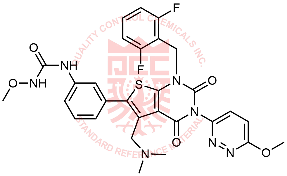 Synonyms: 1-(3-(1-(2,6-difluorobenzyl)-5-((dimethylamino)methyl)-3-(6-methoxypyridazin-3-yl)-2,4-dioxo-1,2,3,4-tetrahydrothieno[2,3-d]pyrimidin-6-yl)phenyl)-3-methoxyurea