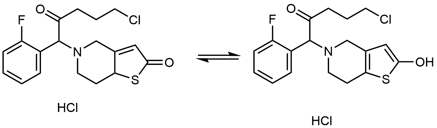 Synonyms: 5-(5-chloro-1-(2-fluorophenyl)-2-oxopentyl)-5,6,7,7a-tetrahydrothieno[3,2-c]pyridin-2(4H)-one hydrochloride/5-chloro-1-(2-fluorophenyl)-1-(2-hydroxy-6,7-dihydrothieno[3,2-c]pyridin-5(4H)-yl)pentan-2-one hydrochloride