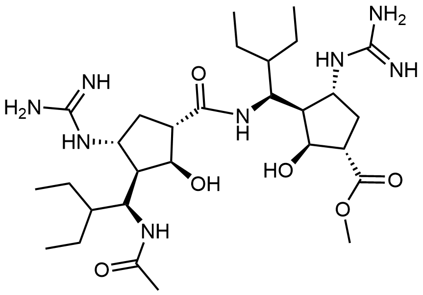 Synonyms: methyl (1S,2S,3R,4R)-3-((S)-1-((1S,2S,3R,4R)-3-((S)-1-acetamido-2-ethylbutyl)-4-guanidino-2-hydroxycyclopentane-1-carboxamido)-2-ethylbutyl)-4-guanidino-2-hydroxycyclopentane-1-carboxylate