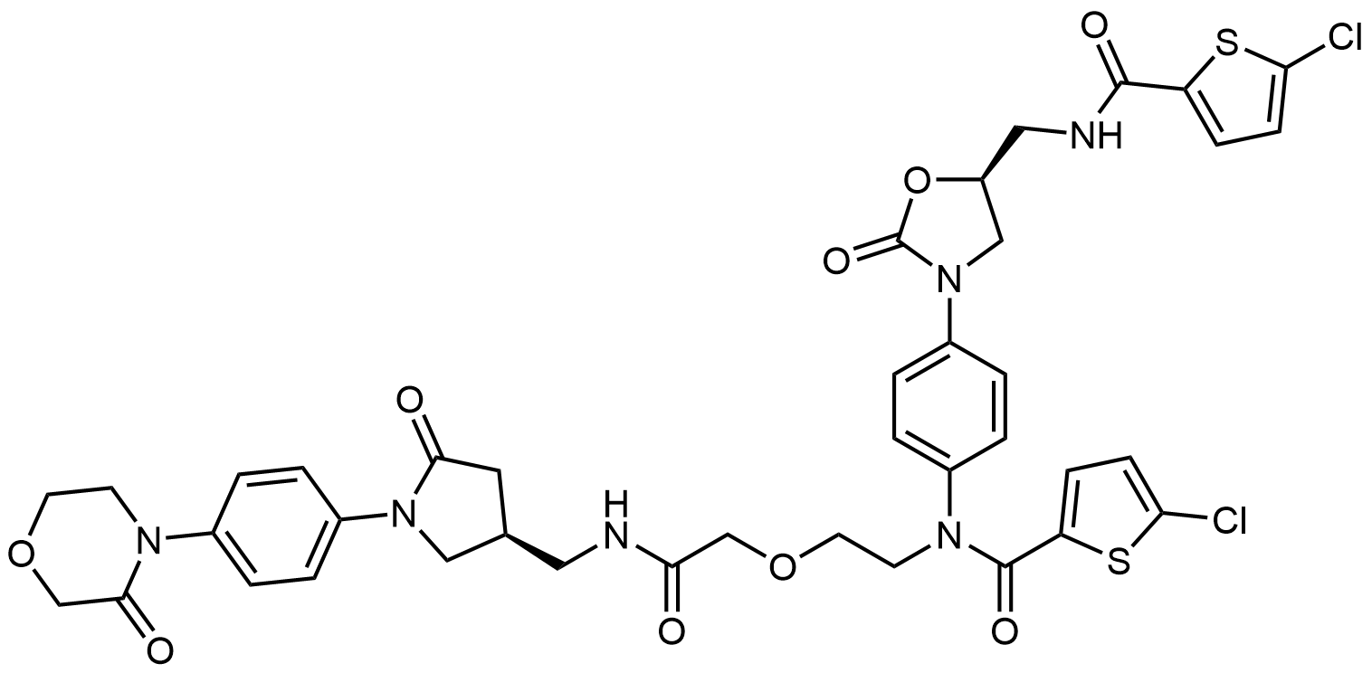 Synonyms: 5-chloro-N-(4-((S)-5-((5-chlorothiophene-2-carboxamido)methyl)-2-oxooxazolidin-3-yl)phenyl)-N-(2-(2-oxo-2-((((S)-5-oxo-1-(4-(3-oxomorpholino)phenyl)pyrrolidin-3-yl)methyl)amino)ethoxy)ethyl)thiophene-2-carboxamide