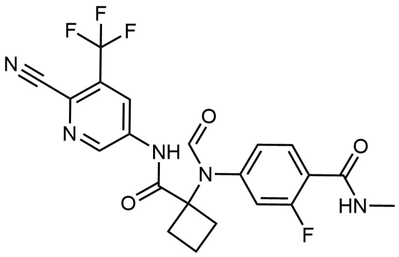 Synonyms: 4-(N-(1-((6-cyano-5-(trifluoromethyl)pyridin-3-yl)carbamoyl)cyclobutyl)formamido)-2-fluoro-N-methylbenzamide