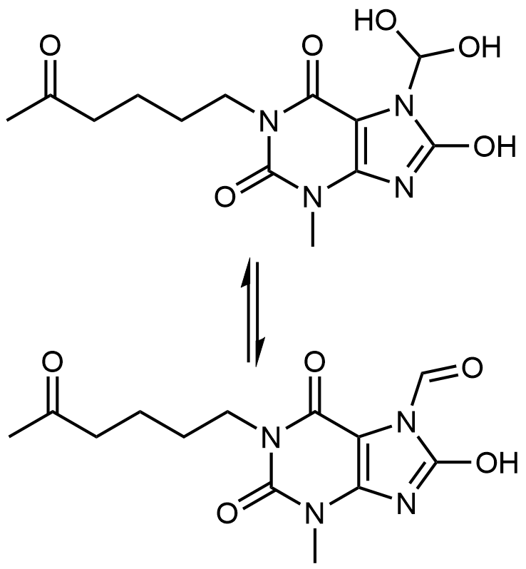 Synonyms: 7-(dihydroxymethyl)-8-hydroxy-3-methyl-1-(5-oxohexyl)-3,7-dihydro-1H-purine-2,6-dione/8-hydroxy-3-methyl-2,6-dioxo-1-(5-oxohexyl)-1,2,3,6-tetrahydro-7H-purine-7-carbaldehyde