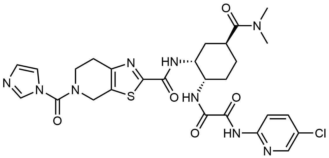 Synonyms: N1-((1S,2R,4S)-2-(5-(1H-imidazole-1-carbonyl)-4,5,6,7-tetrahydrothiazolo[5,4-c]pyridine-2-carboxamido)-4-(dimethylcarbamoyl)cyclohexyl)-N2-(5-chloropyridin-2-yl)oxalamide