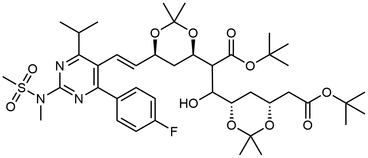 Synonyms: tert-butyl 3-((4S,6R)-6-(2-(tert-butoxy)-2-oxoethyl)-2,2-dimethyl-1,3-dioxan-4-yl)-2-((4R,6S)-6-((E)-2-(4-(4-fluorophenyl)-6-isopropyl-2-(N-methylmethylsulfonamido)pyrimidin-5-yl)vinyl)-2,2-dimethyl-1,3-dioxan-4-yl)-3-hydroxypropanoate