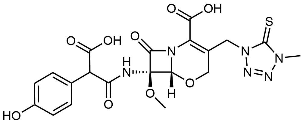 Synonyms: (6R,7R)-7-(2-carboxy-2-(4-hydroxyphenyl)acetamido)-7-methoxy-3-((4-methyl-5-thioxo-4,5-dihydro-1H-tetrazol-1-yl)methyl)-8-oxo-5-oxa-1-azabicyclo[4.2.0]oct-2-ene-2-carboxylic acid