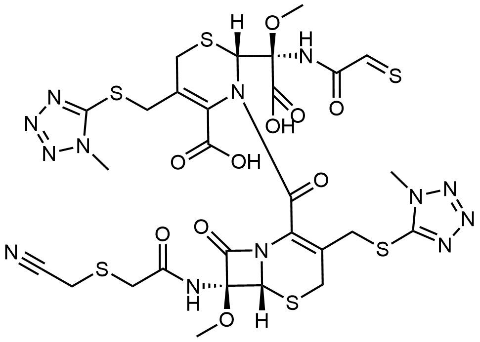 Synonyms: (R)-2-((S)-carboxy(methoxy)(2-thioxoacetamido)methyl)-3-((6R,7S)-7-(2-((cyanomethyl)thio)acetamido)-7-methoxy-3-(((1-methyl-1H-tetrazol-5-yl)thio)methyl)-8-oxo-5-thia-1-azabicyclo[4.2.0]oct-2-ene-2-carbonyl)-5-(((1-methyl-1H-tetrazol-5-yl)thio)methyl)-3,6-dihydro-2H-1,3-thiazine-4-carboxylic acid