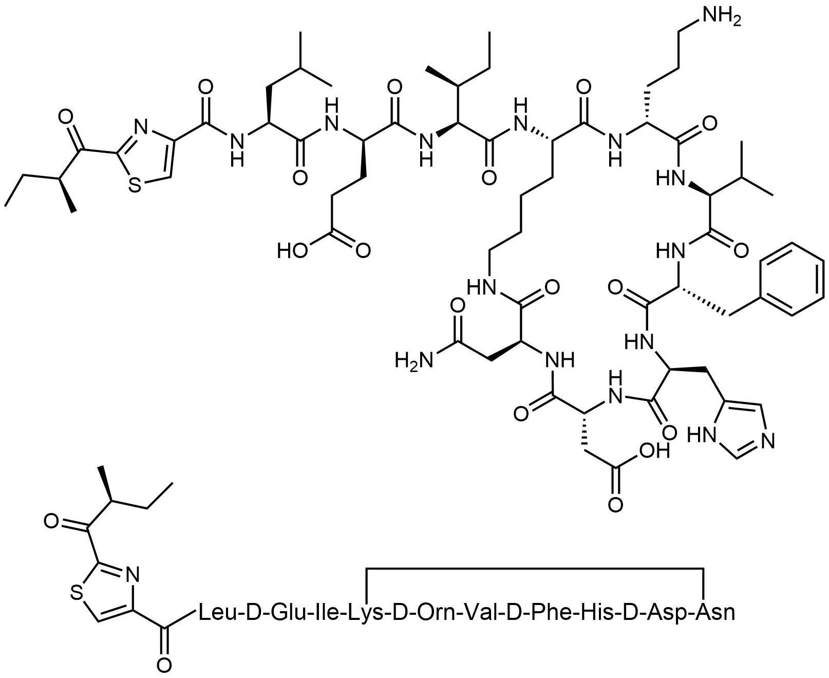 Synonyms: (R)-5-(((2S,3S)-1-(((3S,6R,9S,12R,15S,18R,21S)-9-((1H-imidazol-5-yl)methyl)-3-(2-amino-2-oxoethyl)-18-(3-aminopropyl)-12-benzyl-6-(carboxymethyl)-15-isopropyl-2,5,8,11,14,17,20-heptaoxo-1,4,7,10,13,16,19-heptaazacyclopentacosan-21-yl)amino)-3-methyl-1-oxopentan-2-yl)amino)-4-((S)-4-methyl-2-(2-((S)-2-methylbutanoyl)thiazole-4-carboxamido)pentanamido)-5-oxopentanoic acid