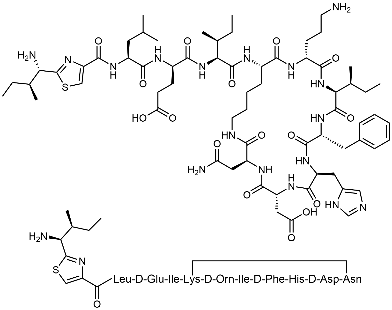 Synonyms: (R)-5-(((2S,3S)-1-(((3S,6R,9S,12R,15S,18R,21S)-9-((1H-imidazol-5-yl)methyl)-3-(2-amino-2-oxoethyl)-18-(3-aminopropyl)-12-benzyl-15-((S)-sec-butyl)-6-(carboxymethyl)-2,5,8,11,14,17,20-heptaoxo-1,4,7,10,13,16,19-heptaazacyclopentacosan-21-yl)amino)-3-methyl-1-oxopentan-2-yl)amino)-4-((S)-2-(2-((1S,2S)-1-amino-2-methylbutyl)thiazole-4-carboxamido)-4-methylpentanamido)-5-oxopentanoic acid