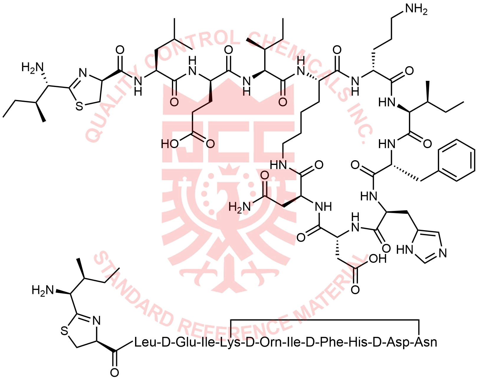 Synonyms: (R)-5-(((2S,3S)-1-(((3S,6R,9S,12R,15S,18R,21S)-9-((1H-imidazol-5-yl)methyl)-3-(2-amino-2-oxoethyl)-18-(3-aminopropyl)-12-benzyl-15-((S)-sec-butyl)-6-(carboxymethyl)-2,5,8,11,14,17,20-heptaoxo-1,4,7,10,13,16,19-heptaazacyclopentacosan-21-yl)amino)-3-methyl-1-oxopentan-2-yl)amino)-4-((S)-2-((S)-2-((1S,2S)-1-amino-2-methylbutyl)-4,5-dihydrothiazole-4-carboxamido)-4-methylpentanamido)-5-oxopentanoic acid