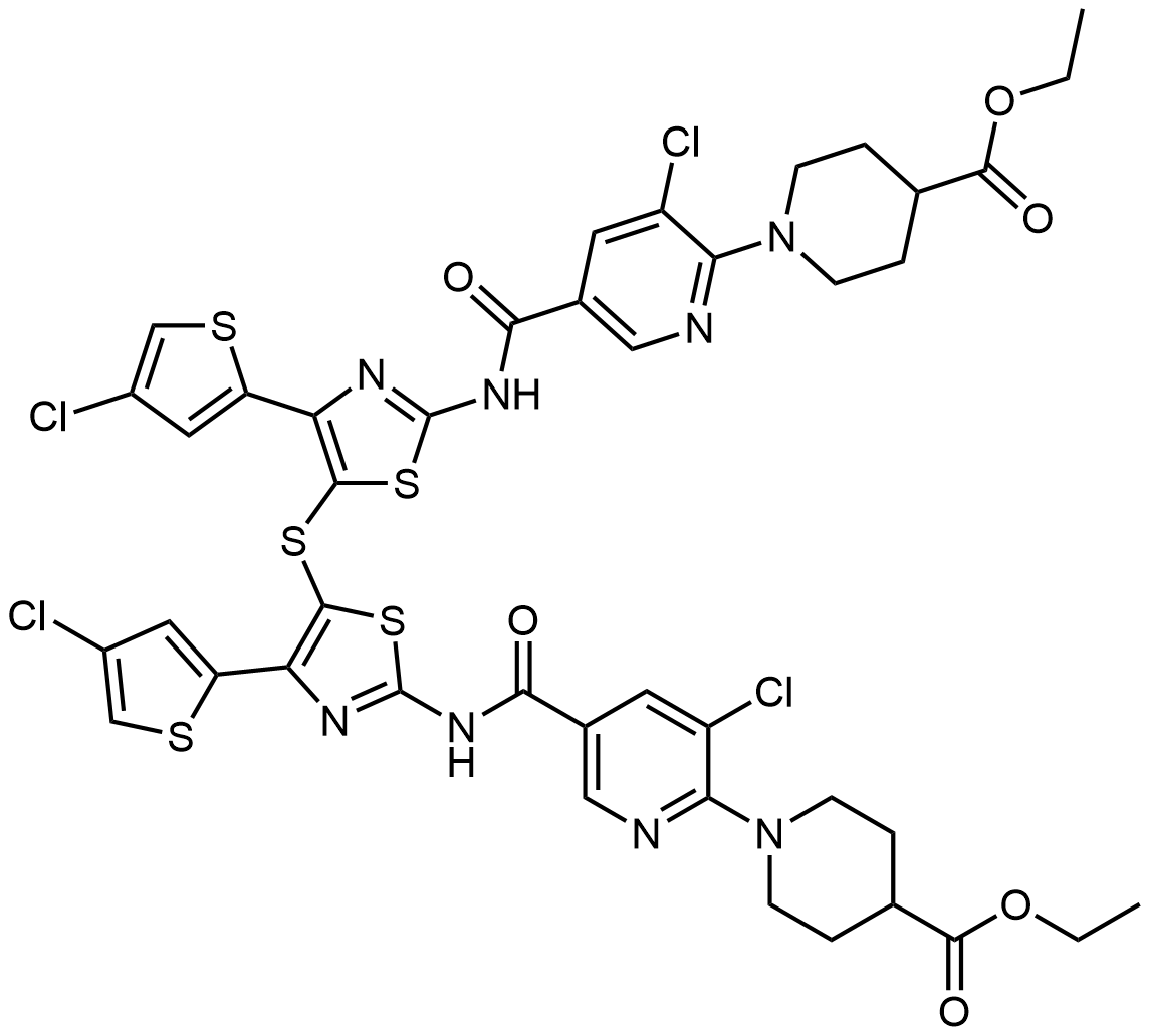 Synonyms: diethyl 1,1'-((((thiobis(4-(4-chlorothiophen-2-yl)thiazole-5,2-diyl))bis(azanediyl))bis(carbonyl))bis(3-chloropyridine-5,2-diyl))bis(piperidine-4-carboxylate)