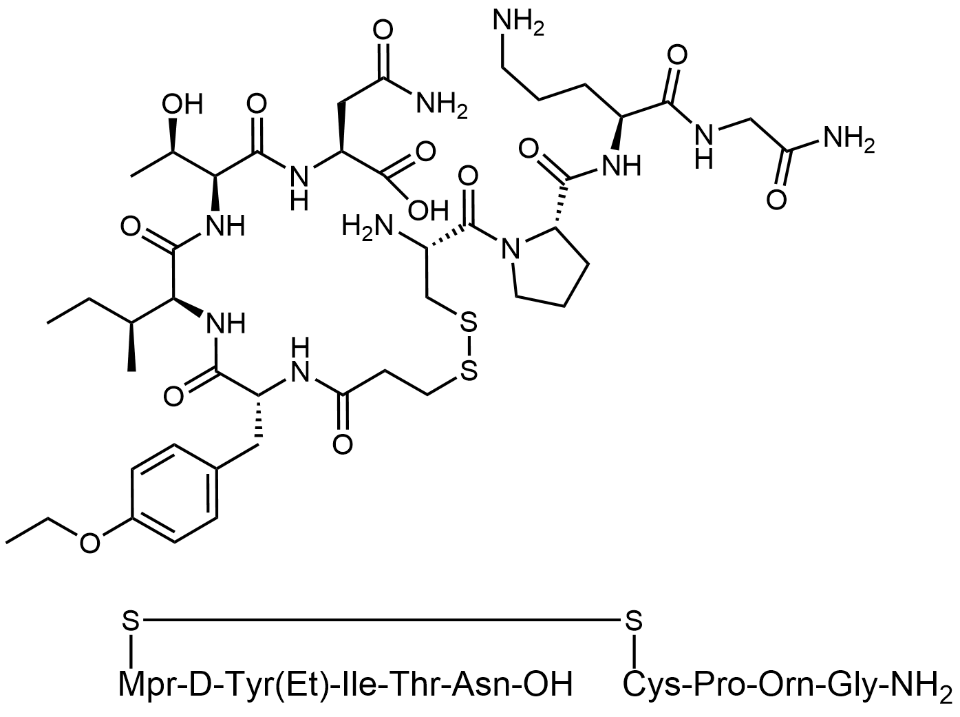 Synonyms: ((R)-2-(3-(((R)-2-amino-3-((S)-2-(((S)-5-amino-1-((2-amino-2-oxoethyl)amino)-1-oxopentan-2-yl)carbamoyl)pyrrolidin-1-yl)-3-oxopropyl)disulfaneyl)propanamido)-3-(4-ethoxyphenyl)propanoyl)-L-isoleucyl-L-threonyl-L-asparagine