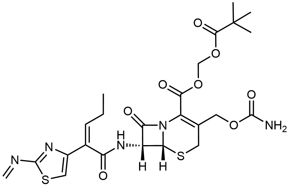 Synonyms: (pivaloyloxy)methyl (6R,7R)-3-((carbamoyloxy)methyl)-7-((Z)-2-(2-(methyleneamino)thiazol-4-yl)pent-2-enamido)-8-oxo-5-thia-1-azabicyclo[4.2.0]oct-2-ene-2-carboxylate