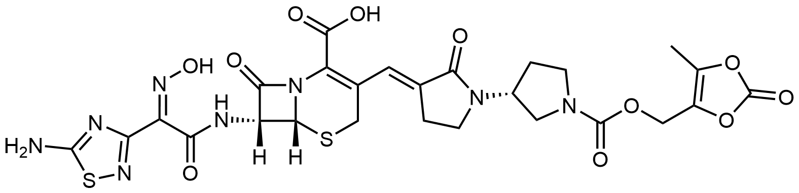 Synonyms: (6R,7R)-7-((Z)-2-(5-amino-1,2,4-thiadiazol-3-yl)-2-(hydroxyimino)acetamido)-3-((E)-((R)-1'-(((5-methyl-2-oxo-1,3-dioxol-4-yl)methoxy)carbonyl)-2-oxo-[1,3'-bipyrrolidin]-3-ylidene)methyl)-8-oxo-5-thia-1-azabicyclo[4.2.0]oct-2-ene-2-carboxylic acid