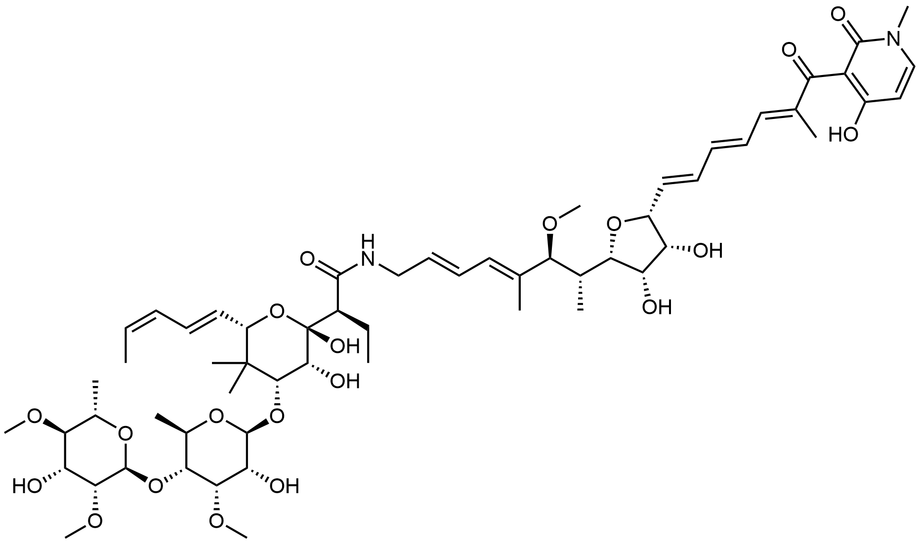 Synonyms: (S)-2-((2R,3R,4R,6S)-2,3-dihydroxy-4-(((2S,3R,4S,5R,6R)-3-hydroxy-5-(((2S,3R,4R,5R,6S)-4-hydroxy-3,5-dimethoxy-6-methyltetrahydro-2H-pyran-2-yl)oxy)-4-methoxy-6-methyltetrahydro-2H-pyran-2-yl)oxy)-5,5-dimethyl-6-((1E,3Z)-penta-1,3-dien-1-yl)tetrahydro-2H-pyran-2-yl)-N-((2E,4E,6S,7R)-7-((2S,3S,4R,5R)-3,4-dihydroxy-5-((1E,3E,5E)-7-(4-hydroxy-1-methyl-2-oxo-1,2-dihydropyridin-3-yl)-6-methyl-7-oxohepta-1,3,5-trien-1-yl)tetrahydrofuran-2-yl)-6-methoxy-5-methylocta-2,4-dien-1-yl)butanamide
