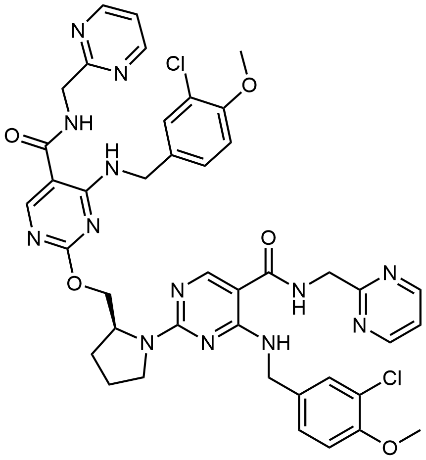 Synonyms: (S)-4-((3-chloro-4-methoxybenzyl)amino)-2-(2-(((4-((3-chloro-4-methoxybenzyl)amino)-5-((pyrimidin-2-ylmethyl)carbamoyl)pyrimidin-2-yl)oxy)methyl)pyrrolidin-1-yl)-N-(pyrimidin-2-ylmethyl)pyrimidine-5-carboxamide