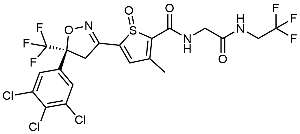 Synonyms: 3-methyl-N-(2-oxo-2-((2,2,2-trifluoroethyl)amino)ethyl)-5-((S)-5-(3,4,5-trichlorophenyl)-5-(trifluoromethyl)-4,5-dihydroisoxazol-3-yl)thiophene-2-carboxamide 1-oxide