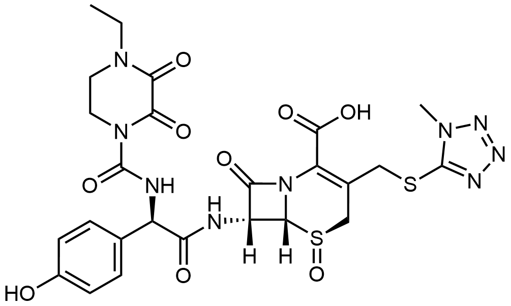 Synonyms: (5R,6R,7R)-7-((R)-2-(4-ethyl-2,3-dioxopiperazine-1-carboxamido)-2-(4-hydroxyphenyl)acetamido)-3-(((1-methyl-1H-tetrazol-5-yl)thio)methyl)-8-oxo-5-thia-1-azabicyclo[4.2.0]oct-2-ene-2-carboxylic acid 5-oxide