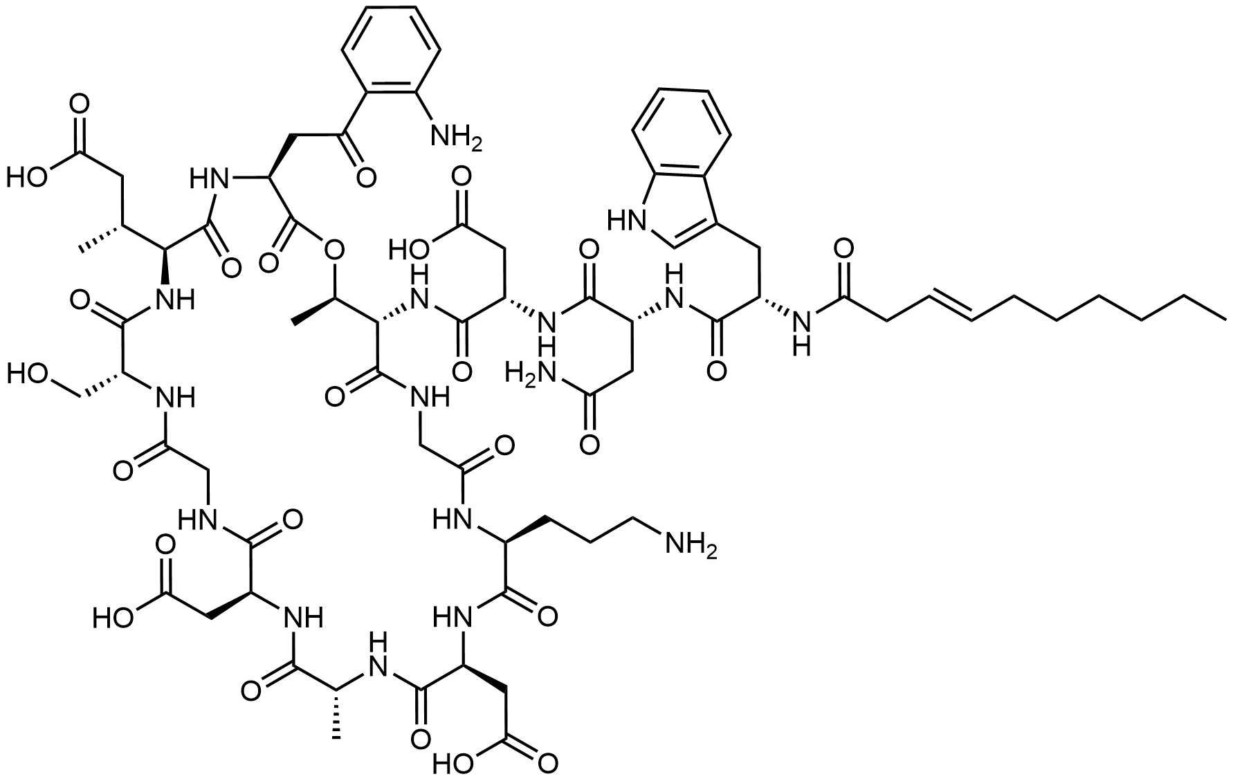 Synonyms: 2,2'-((3S,6S,9R,15S,18R,21S,24S,30S,31R)-30-((S)-2-((R)-4-amino-2-((S)-2-((E)-dec-3-enamido)-3-(1H-indol-3-yl)propanamido)-4-oxobutanamido)-3-carboxypropanamido)-3-(2-(2-aminophenyl)-2-oxoethyl)-24-(3-aminopropyl)-6-((R)-1-carboxypropan-2-yl)-9-(hydroxymethyl)-18,31-dimethyl-2,5,8,11,14,17,20,23,26,29-decaoxo-1-oxa-4,7,10,13,16,19,22,25,28-nonaazacyclohentriacontane-15,21-diyl)diacetic acid