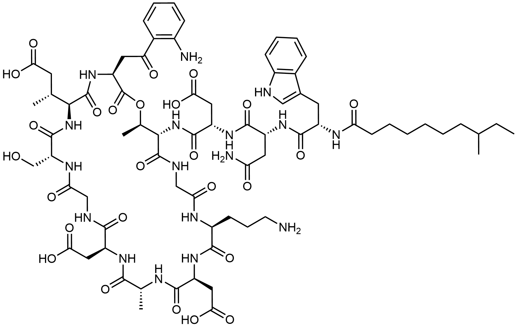 Synonyms: 2,2'-((3S,6S,9R,15S,18R,21S,24S,30S,31R)-30-((2S)-2-((2R)-2-((2S)-3-(1H-indol-3-yl)-2-(8-methyldecanamido)propanamido)-4-amino-4-oxobutanamido)-3-carboxypropanamido)-3-(2-(2-aminophenyl)-2-oxoethyl)-24-(3-aminopropyl)-6-((R)-1-carboxypropan-2-yl)-9-(hydroxymethyl)-18,31-dimethyl-2,5,8,11,14,17,20,23,26,29-decaoxo-1-oxa-4,7,10,13,16,19,22,25,28-nonaazacyclohentriacontane-15,21-diyl)diacetic acid