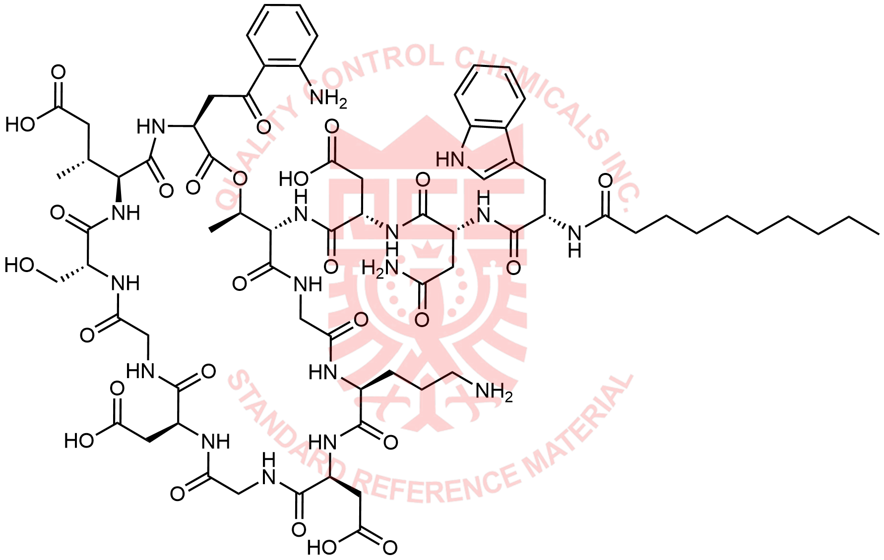 Synonyms: 2,2'-((3S,6S,9R,15S,21S,24S,30S,31R)-30-((S)-2-((R)-4-amino-2-((S)-2-decanamido-3-(1H-indol-3-yl)propanamido)-4-oxobutanamido)-3-carboxypropanamido)-3-(2-(2-aminophenyl)-2-oxoethyl)-24-(3-aminopropyl)-6-((R)-1-carboxypropan-2-yl)-9-(hydroxymethyl)-31-methyl-2,5,8,11,14,17,20,23,26,29-decaoxo-1-oxa-4,7,10,13,16,19,22,25,28-nonaazacyclohentriacontane-15,21-diyl)diacetic acid
