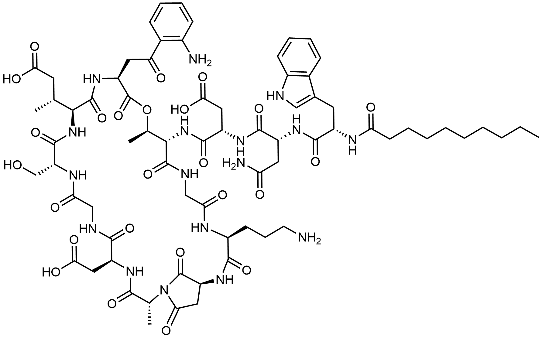 Synonyms: (3S)-3-((R)-4-amino-2-((S)-2-decanamido-3-(1H-indol-3-yl)propanamido)-4-oxobutanamido)-4-(((2R,5S,11R,14S,17S,20R,21S,27S,30S)-17-(2-(2-aminophenyl)-2-oxoethyl)-27-(3-aminopropyl)-5-(carboxymethyl)-14-((R)-1-carboxypropan-2-yl)-11-(hydroxymethyl)-2,20-dimethyl-3,6,9,12,15,18,22,25,28,32,33-undecaoxo-19-oxa-1,4,7,10,13,16,23,26,29-nonaazabicyclo[28.2.1]tritriacontan-21-yl)amino)-4-oxobutanoic acid