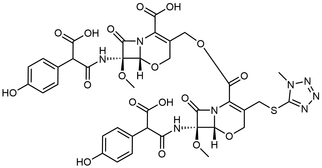 Synonyms: (6R,7R)-7-(2-carboxy-2-(4-hydroxyphenyl)acetamido)-3-((((6R,7R)-7-(2-carboxy-2-(4-hydroxyphenyl)acetamido)-7-methoxy-3-(((1-methyl-1H-tetrazol-5-yl)thio)methyl)-8-oxo-5-oxa-1-azabicyclo[4.2.0]oct-2-ene-2-carbonyl)oxy)methyl)-7-methoxy-8-oxo-5-oxa-1-azabicyclo[4.2.0]oct-2-ene-2-carboxylic acid