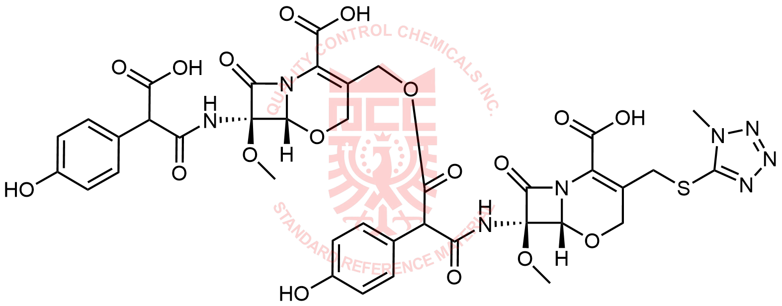 Synonyms: (6R,7R)-7-(2-carboxy-2-(4-hydroxyphenyl)acetamido)-3-(((3-(((6R,7R)-2-carboxy-7-methoxy-3-(((1-methyl-1H-tetrazol-5-yl)thio)methyl)-8-oxo-5-oxa-1-azabicyclo[4.2.0]oct-2-en-7-yl)amino)-2-(4-hydroxyphenyl)-3-oxopropanoyl)oxy)methyl)-7-methoxy-8-oxo-5-oxa-1-azabicyclo[4.2.0]oct-2-ene-2-carboxylic acid